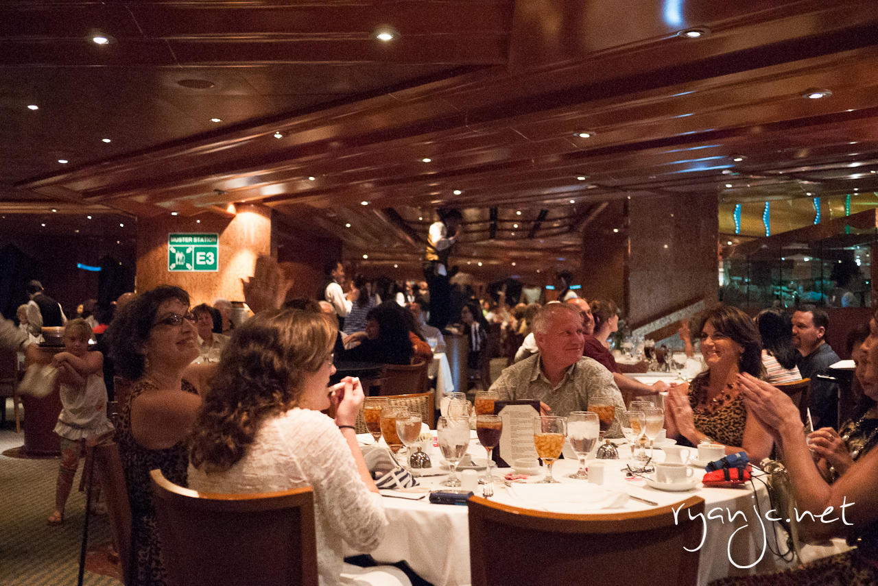 Dinner Sunday night, was the first of two “captain dinners” where the dress was formal and they served lobster or filet mignon. Every other night was pretty casual, and the menu ranged from lesser cuts of steak, fish, seafood, to chicken, pork, or vegetable dishes.